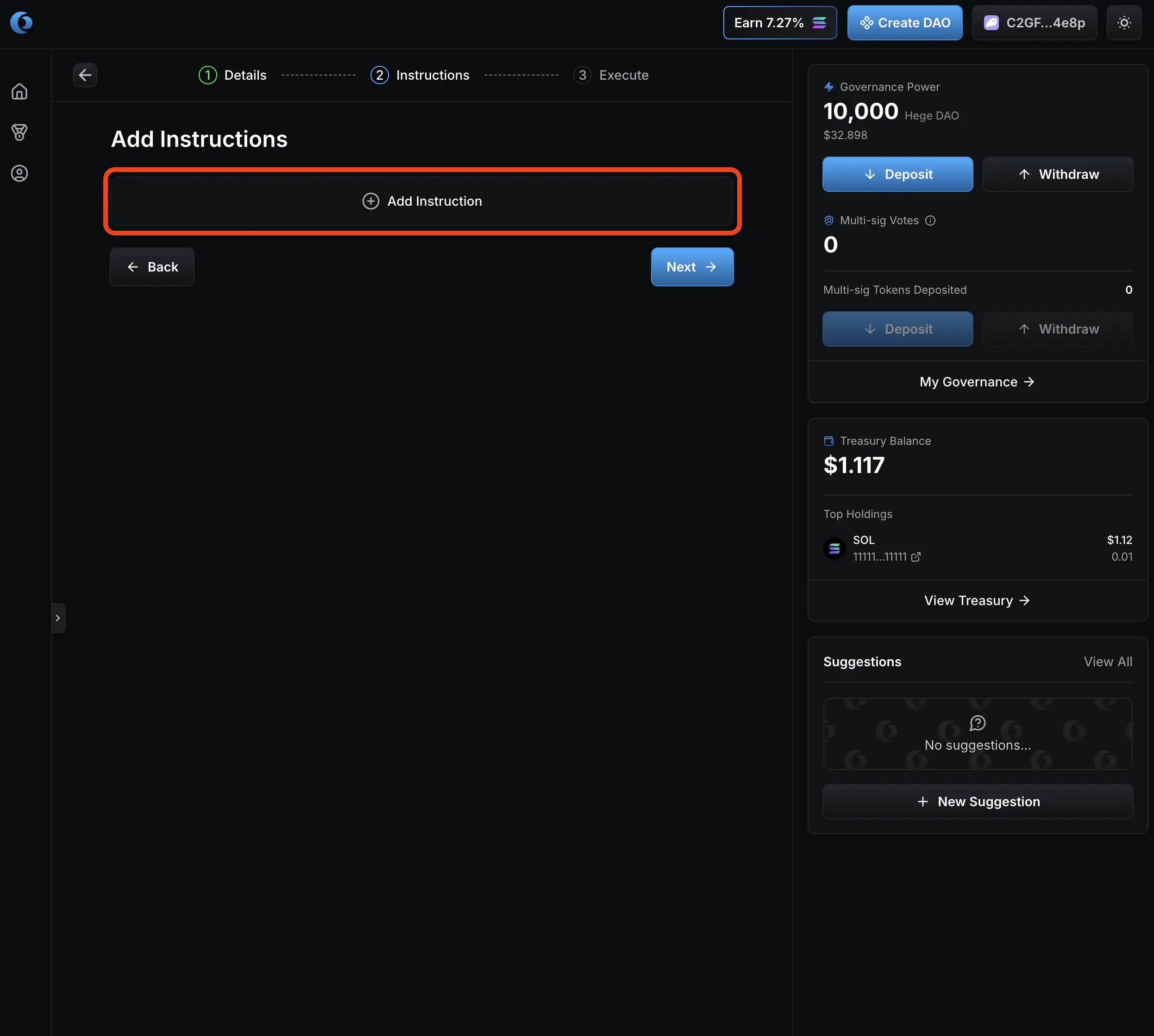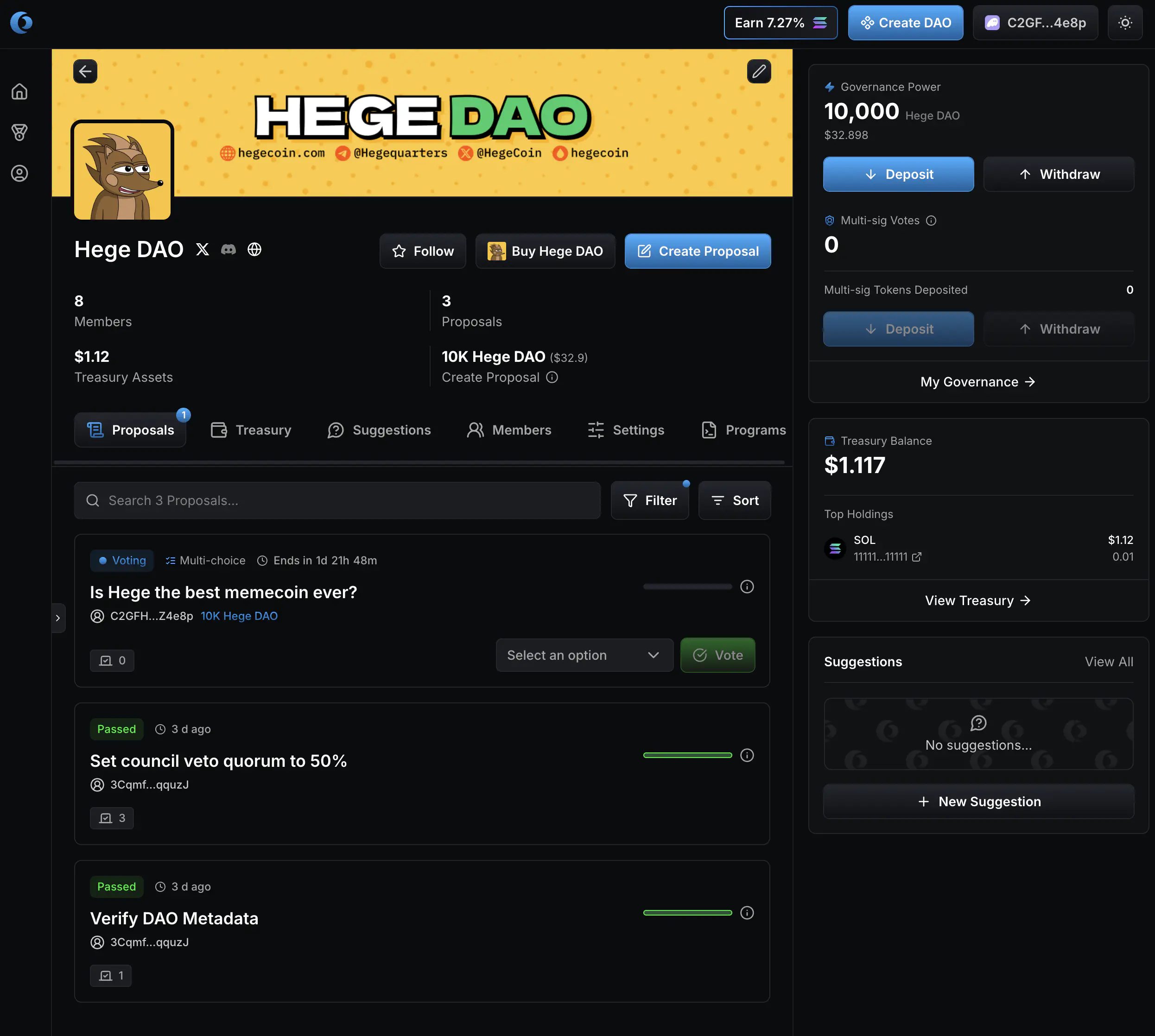 - Go to the Hege DAO page on Realms. Connect your wallet. It should look something like this. You can see how many $HEGE tokens you have deposited in the upper right corner, right next to the banner. (NOTE: You must have at least 10,000 $HEGE deposited to make a proposal. See How to Deposit and Withdraw to learn how to deposit tokens.)