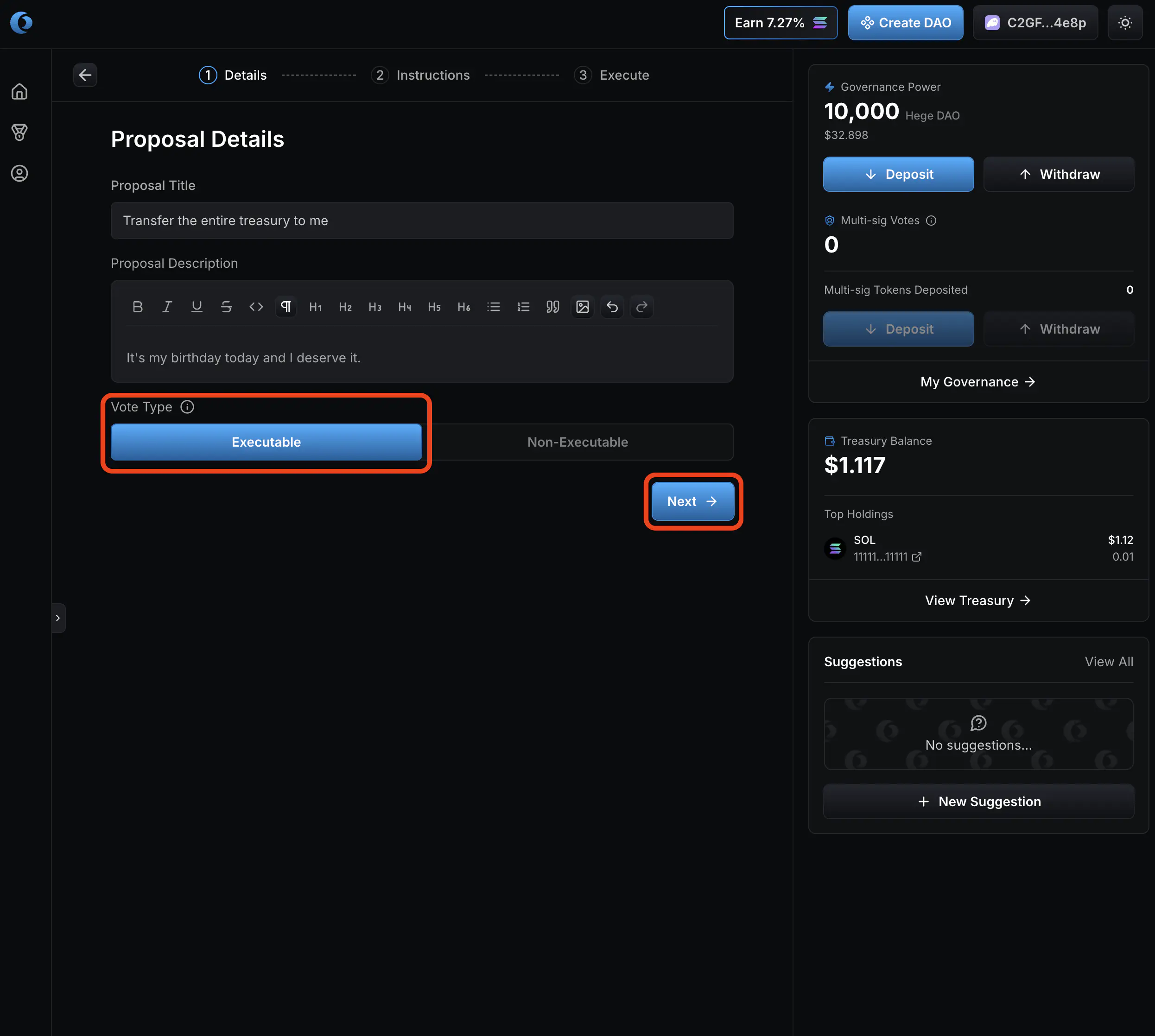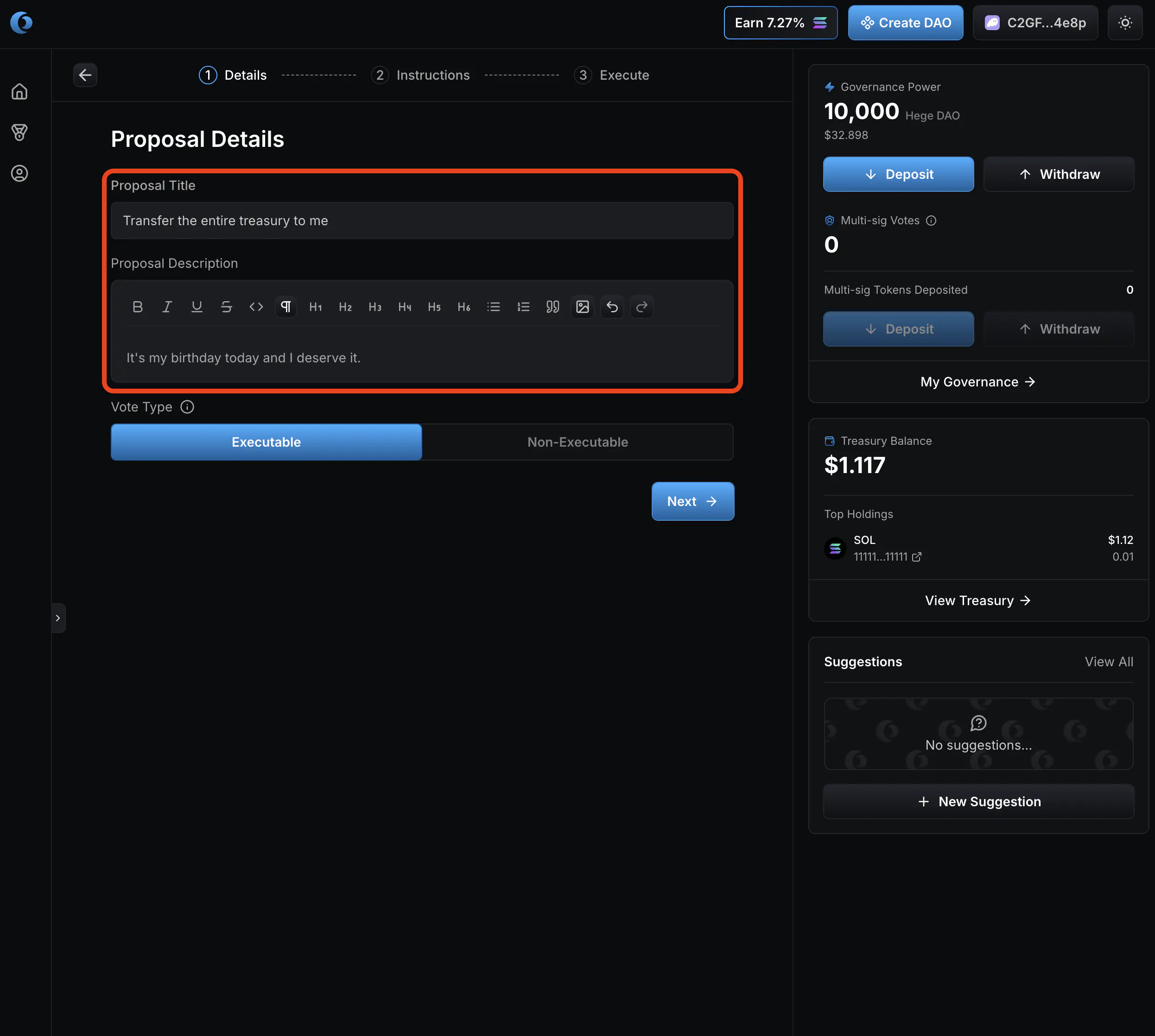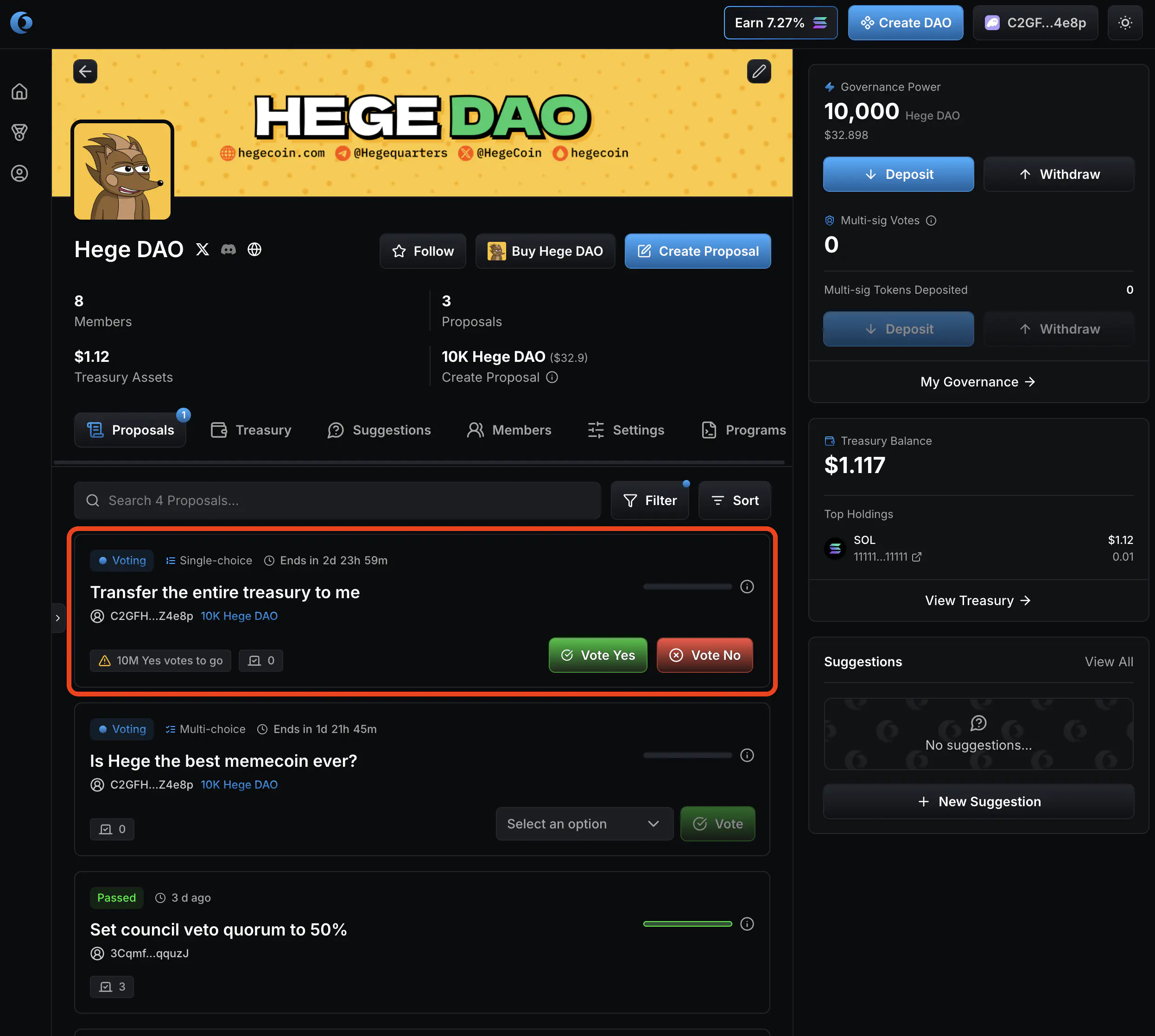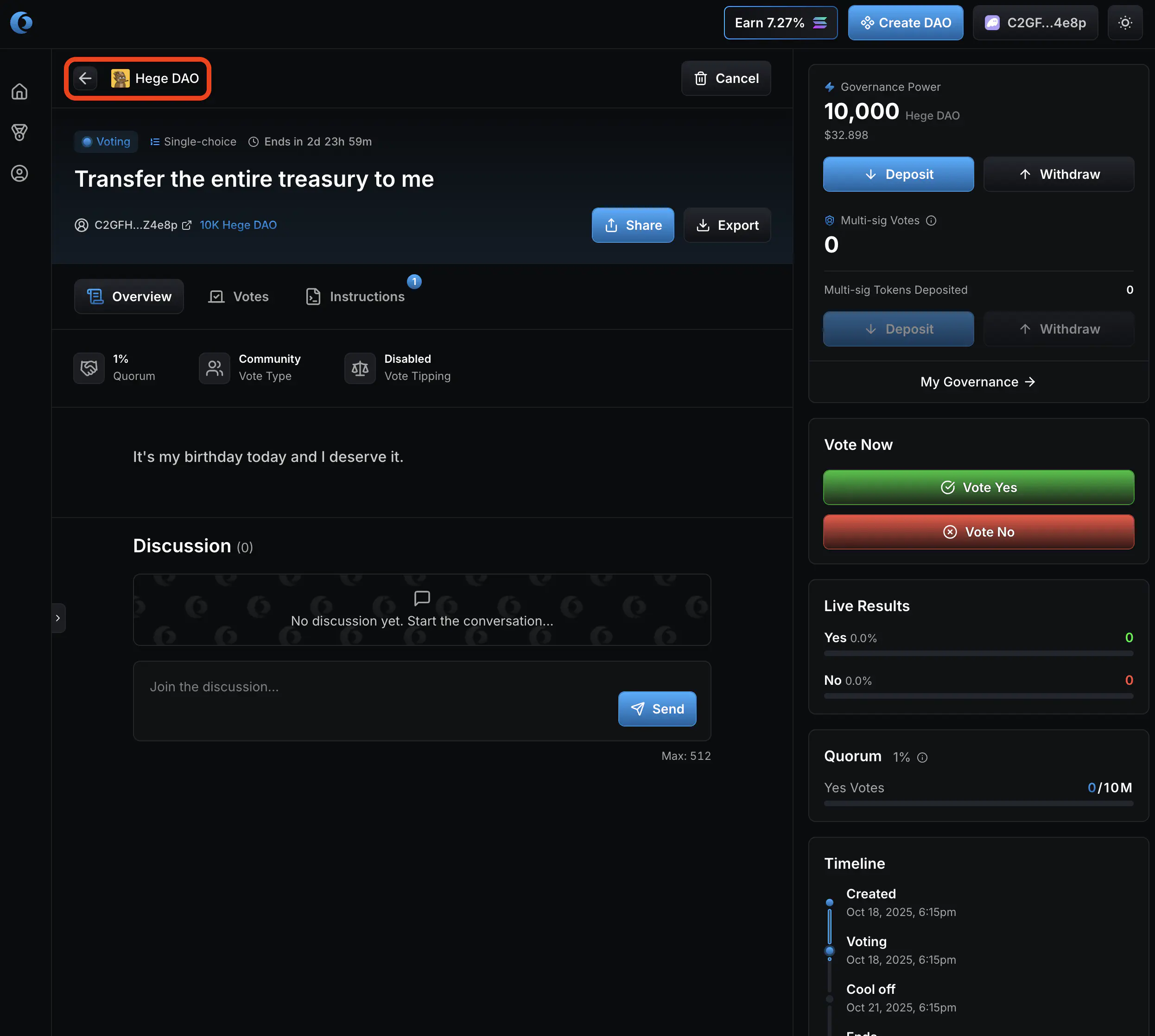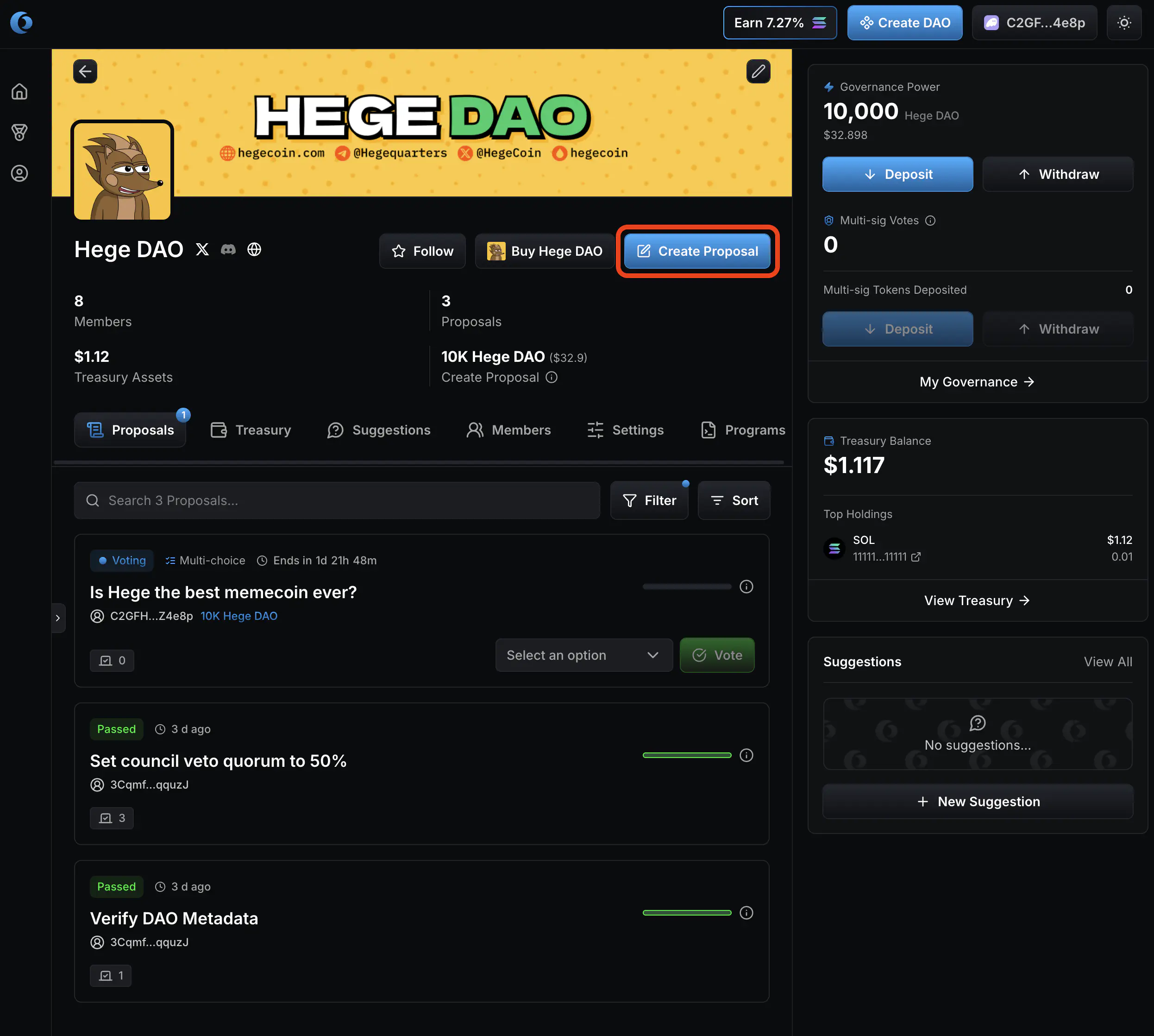 - That’s it! Your proposal is created and open for voting. Now go share it with the Hege community! And don’t forget to vote on your proposal. See How to Vote in the Hege DAO if you need help with that.