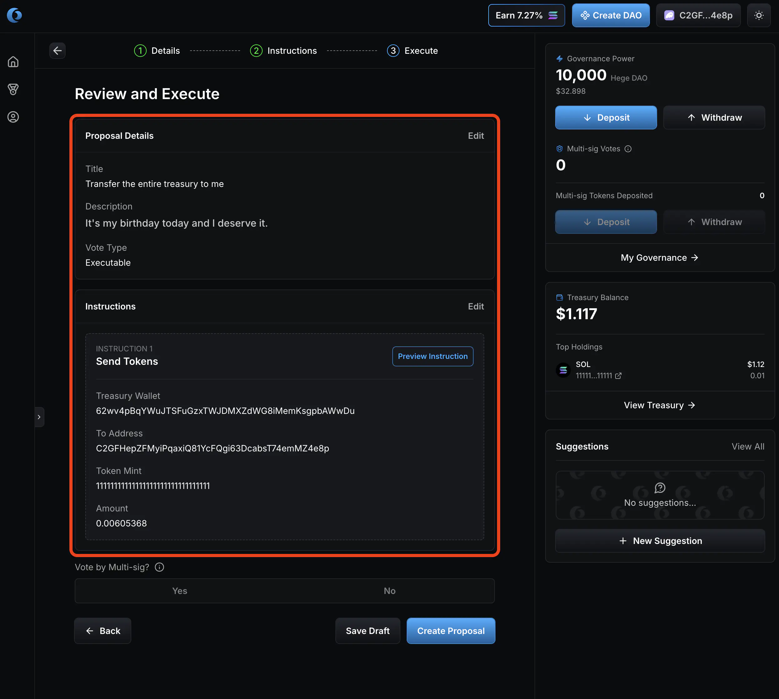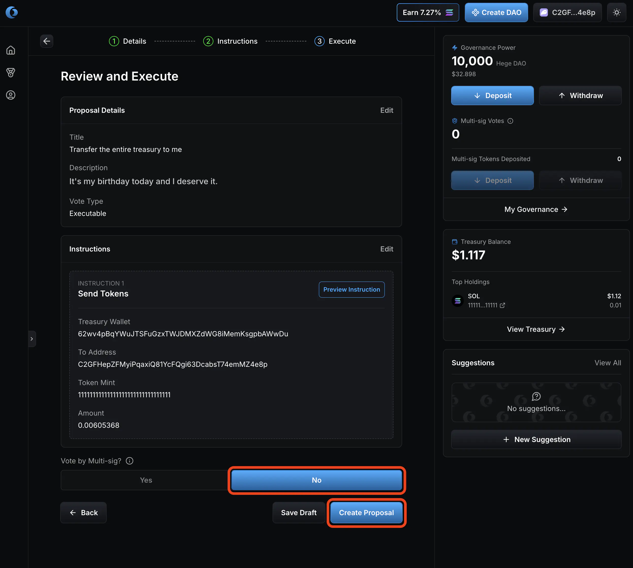 - Select “No” on vote by multi-sig. Then click “Create Proposal”.