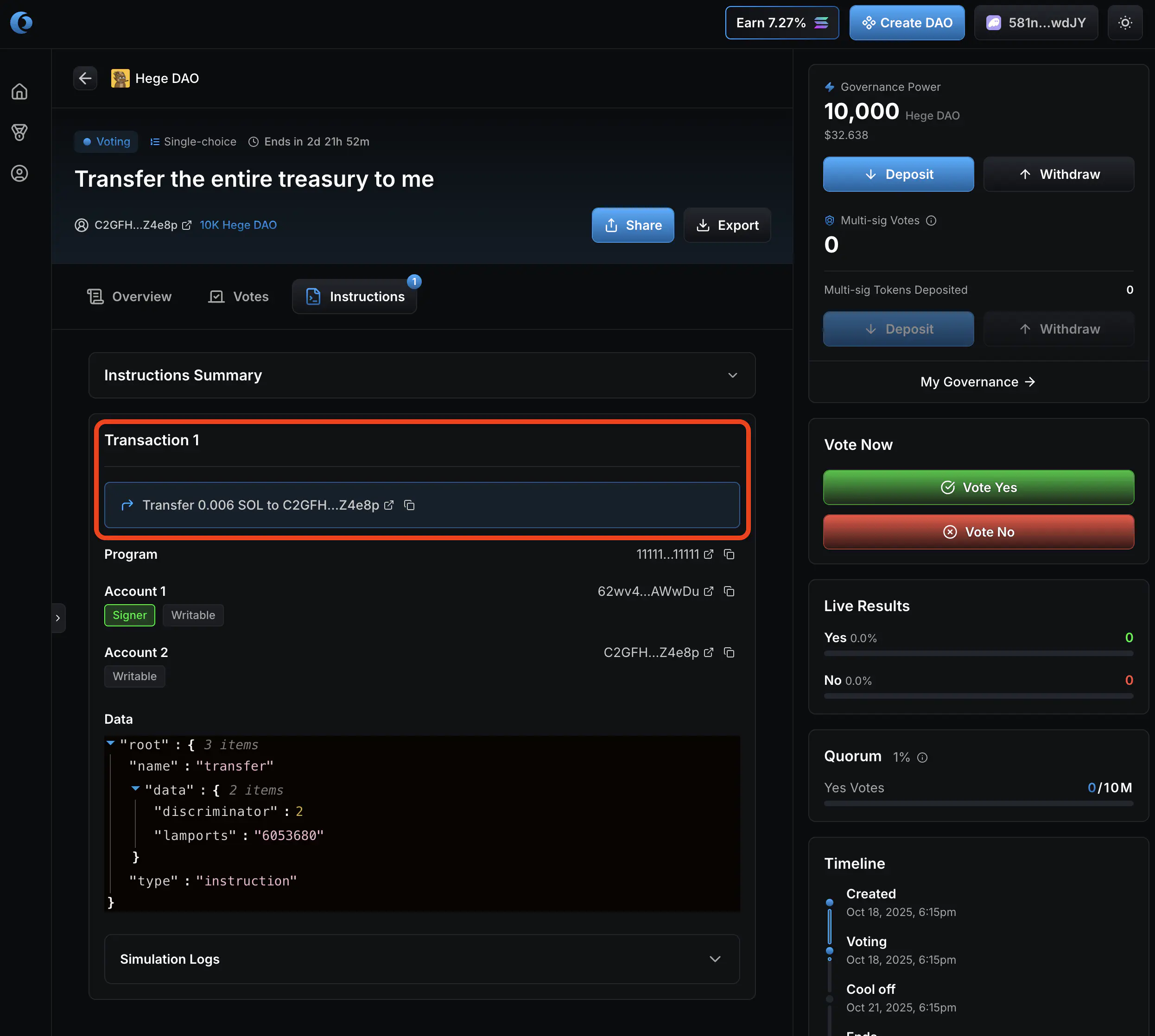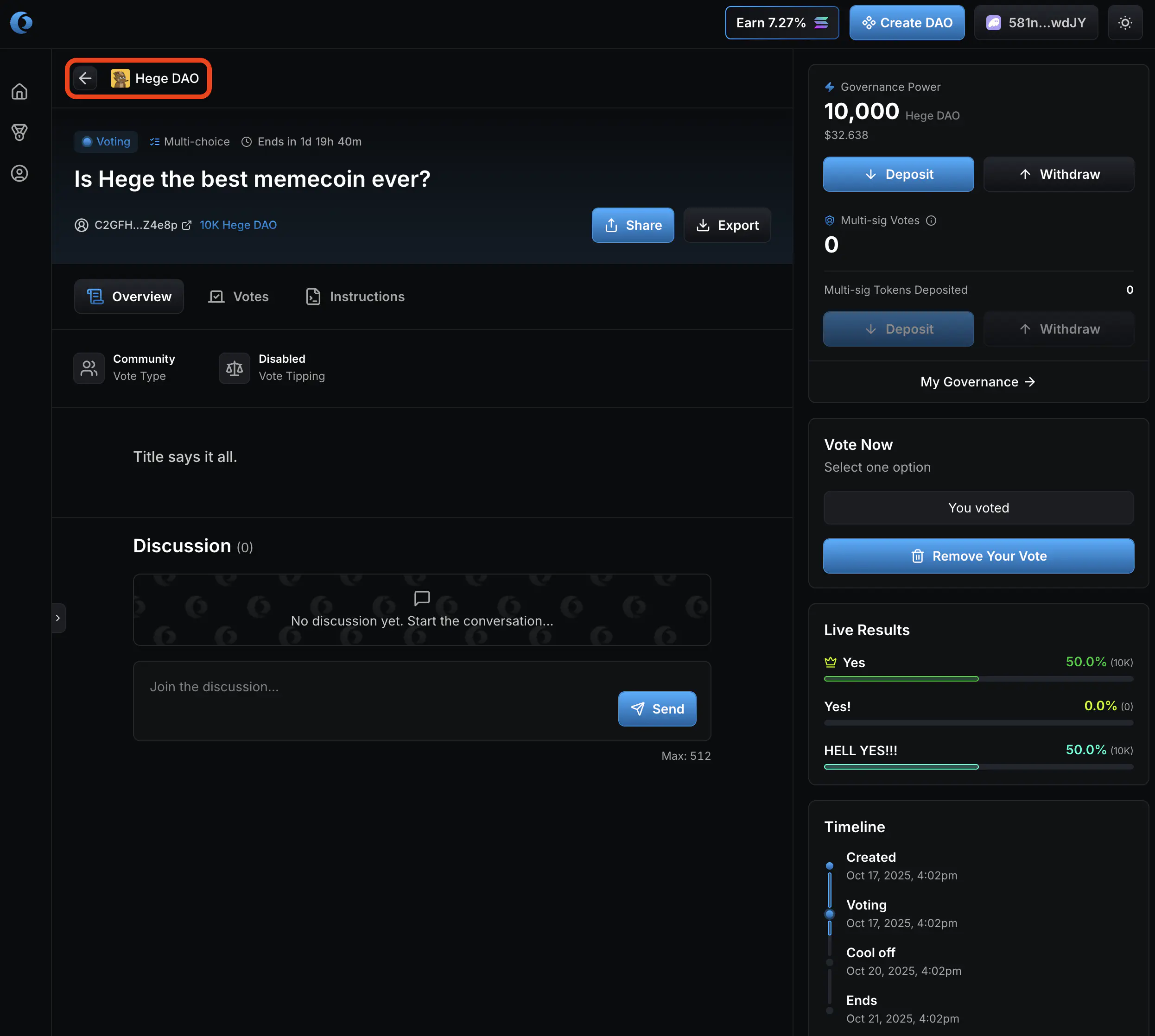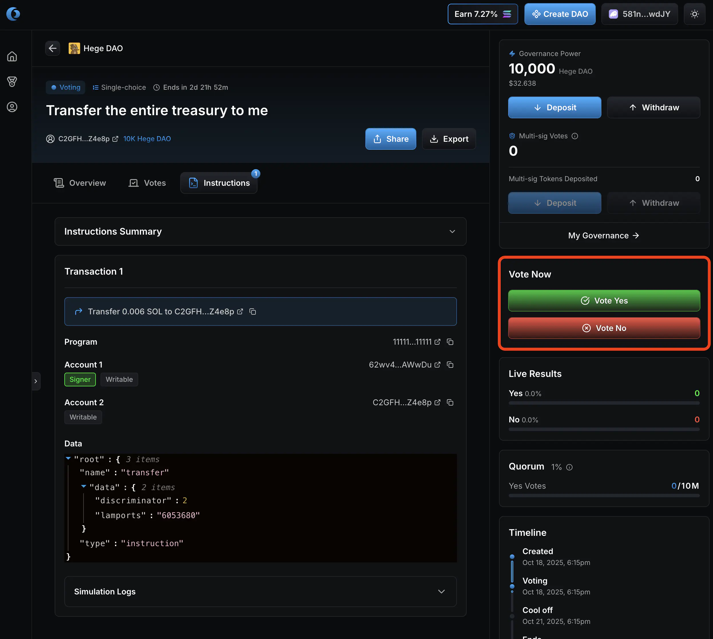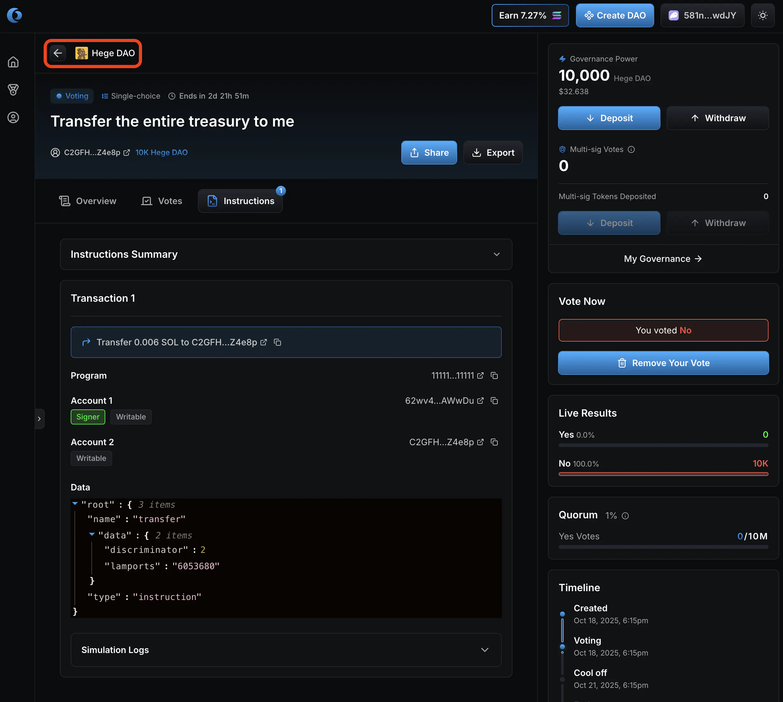 1. Now it’s up to you as a member of the Hege DAO to judge if you think these funds should be spend or not, and vote accordingly. Click “Vote Yes” if you approve the transfer of the funds. Otherwise click “Vote No”.