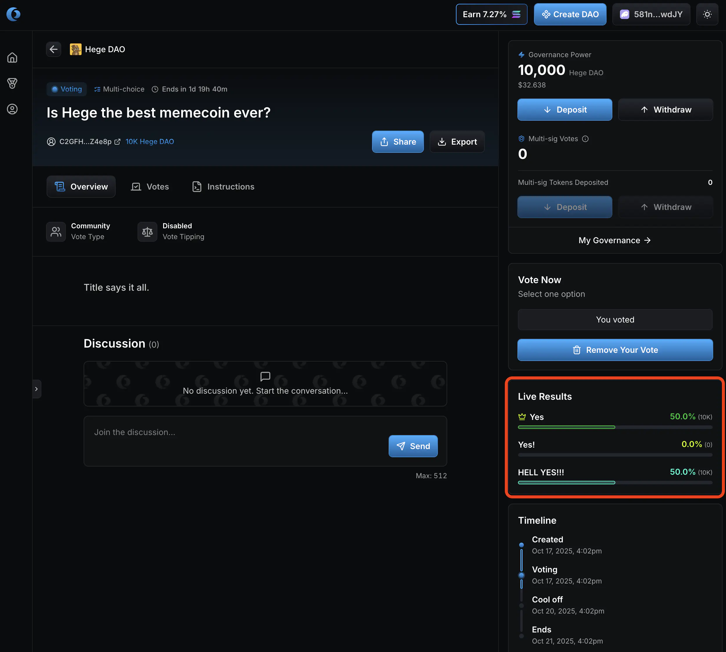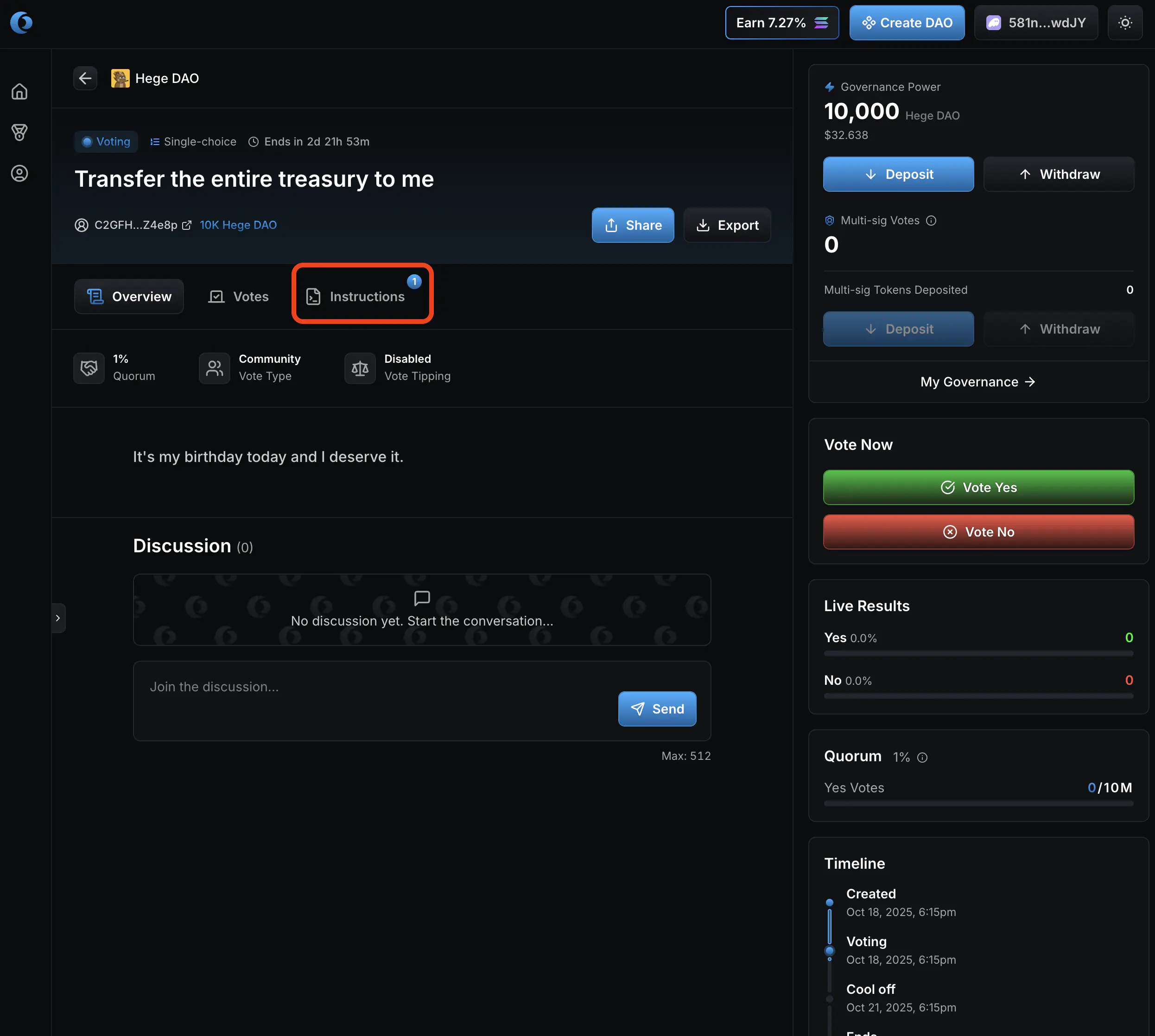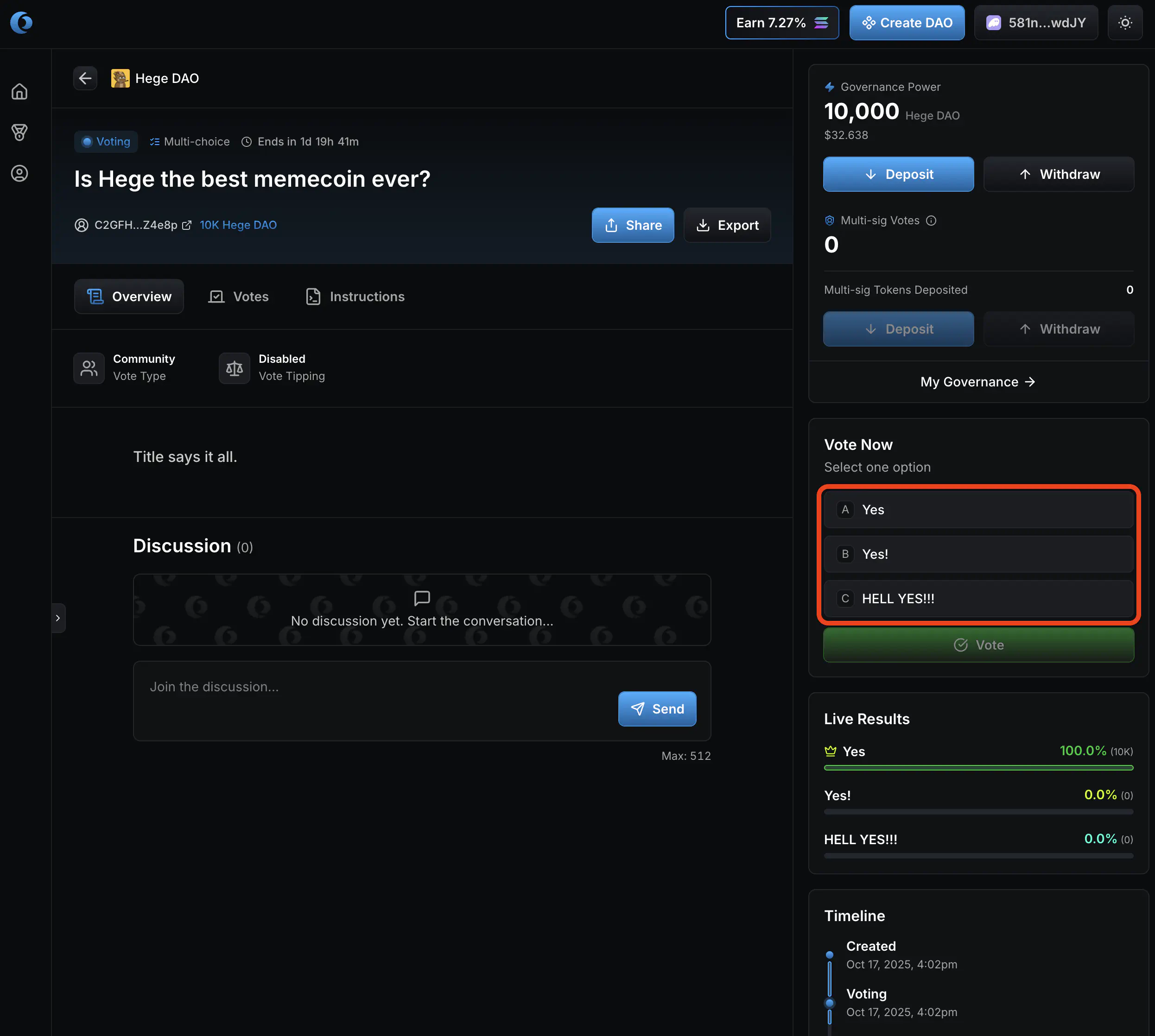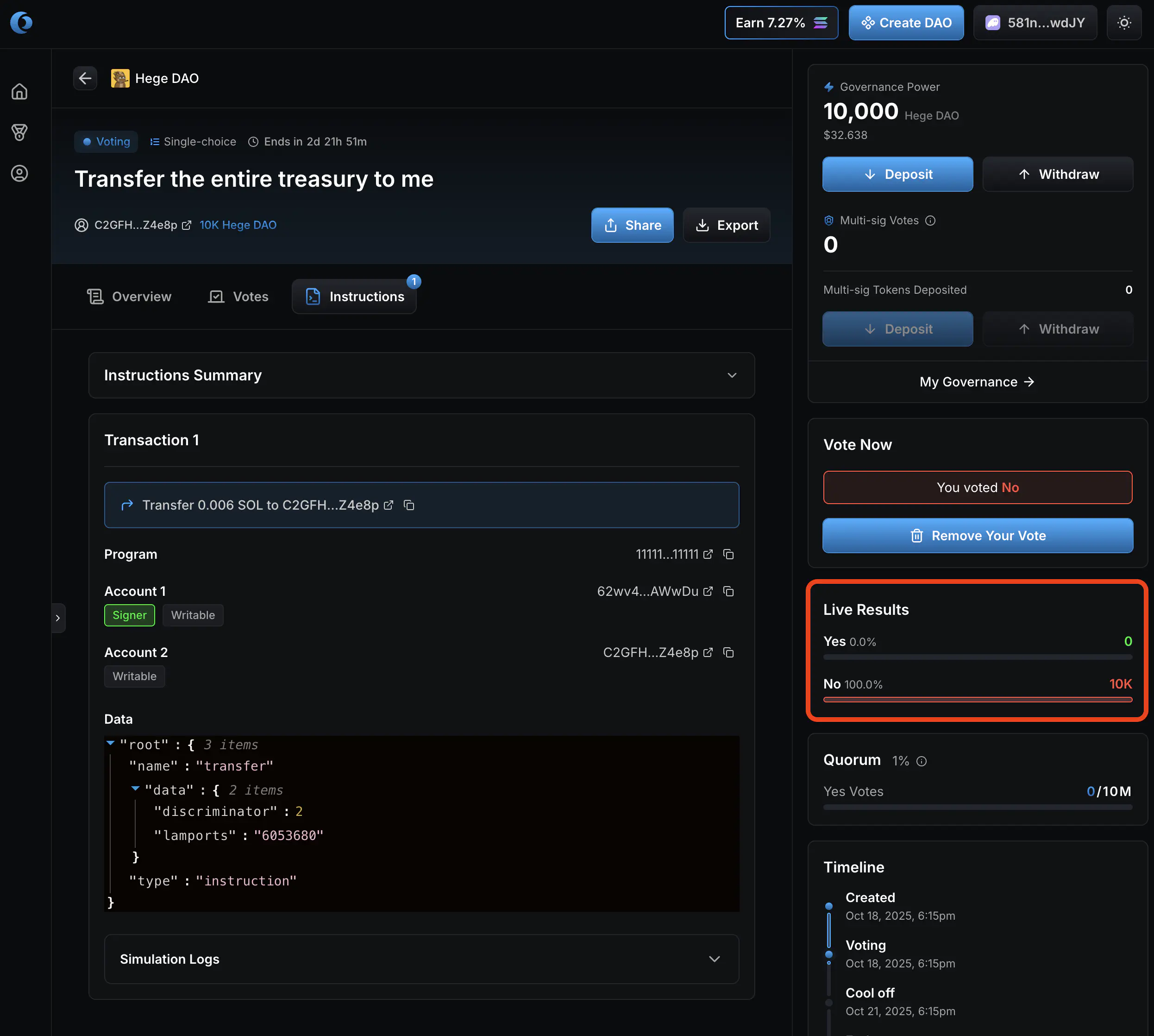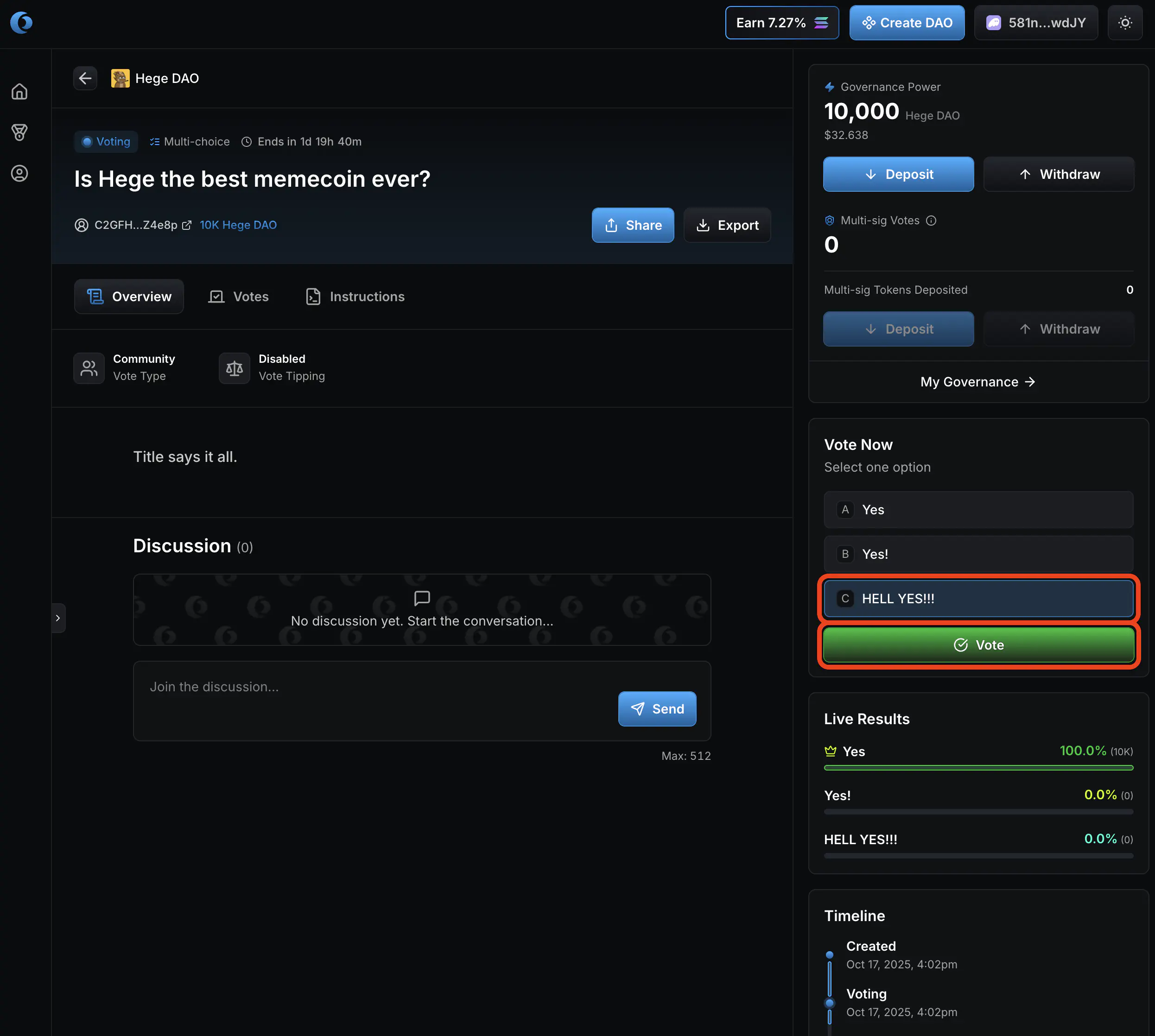 1. Now it’s up to you as a member of the Hege DAO to judge if you think these funds should be spend or not, and vote accordingly. Click “Vote Yes” if you approve the transfer of the funds. Otherwise click “Vote No”.