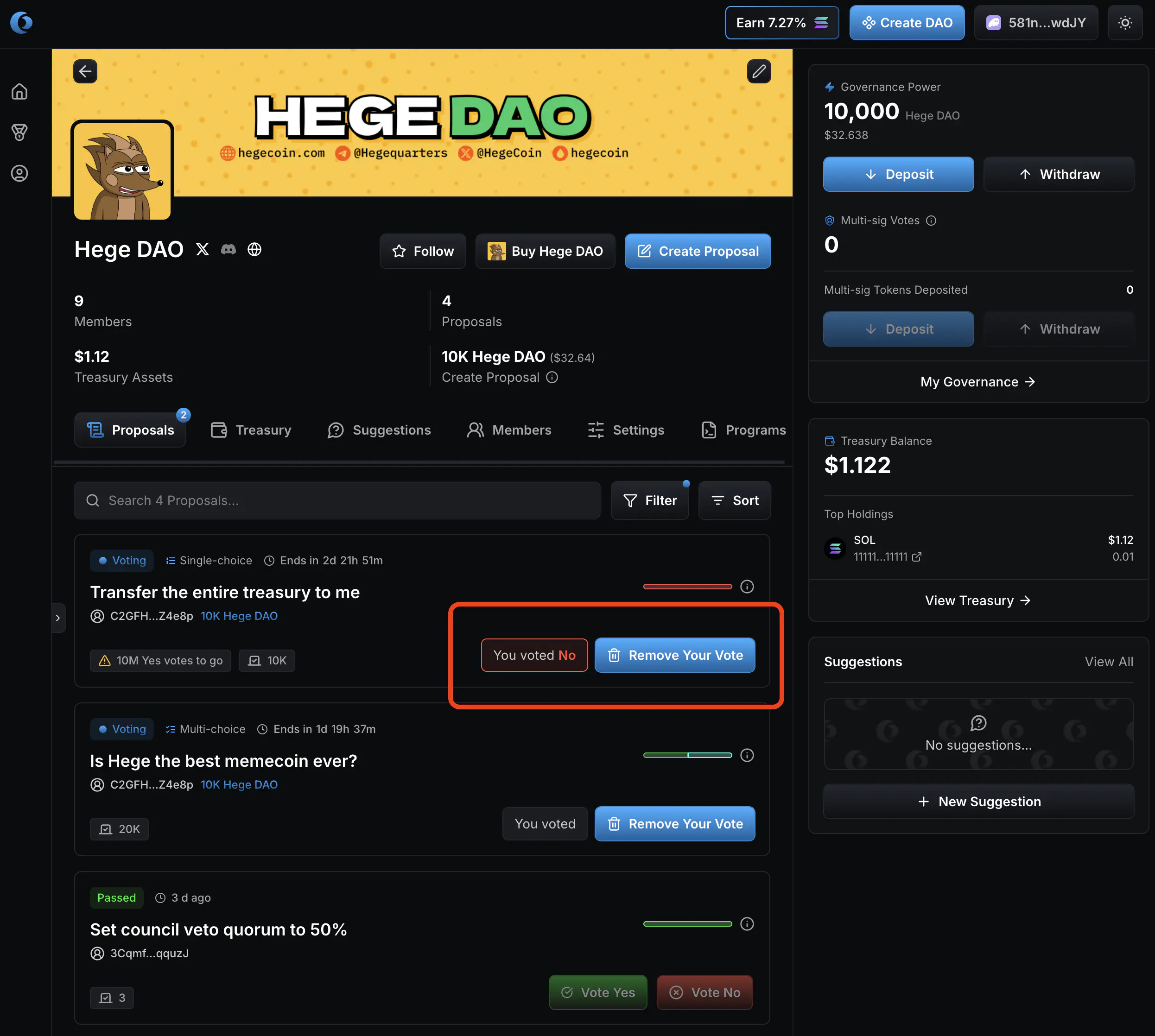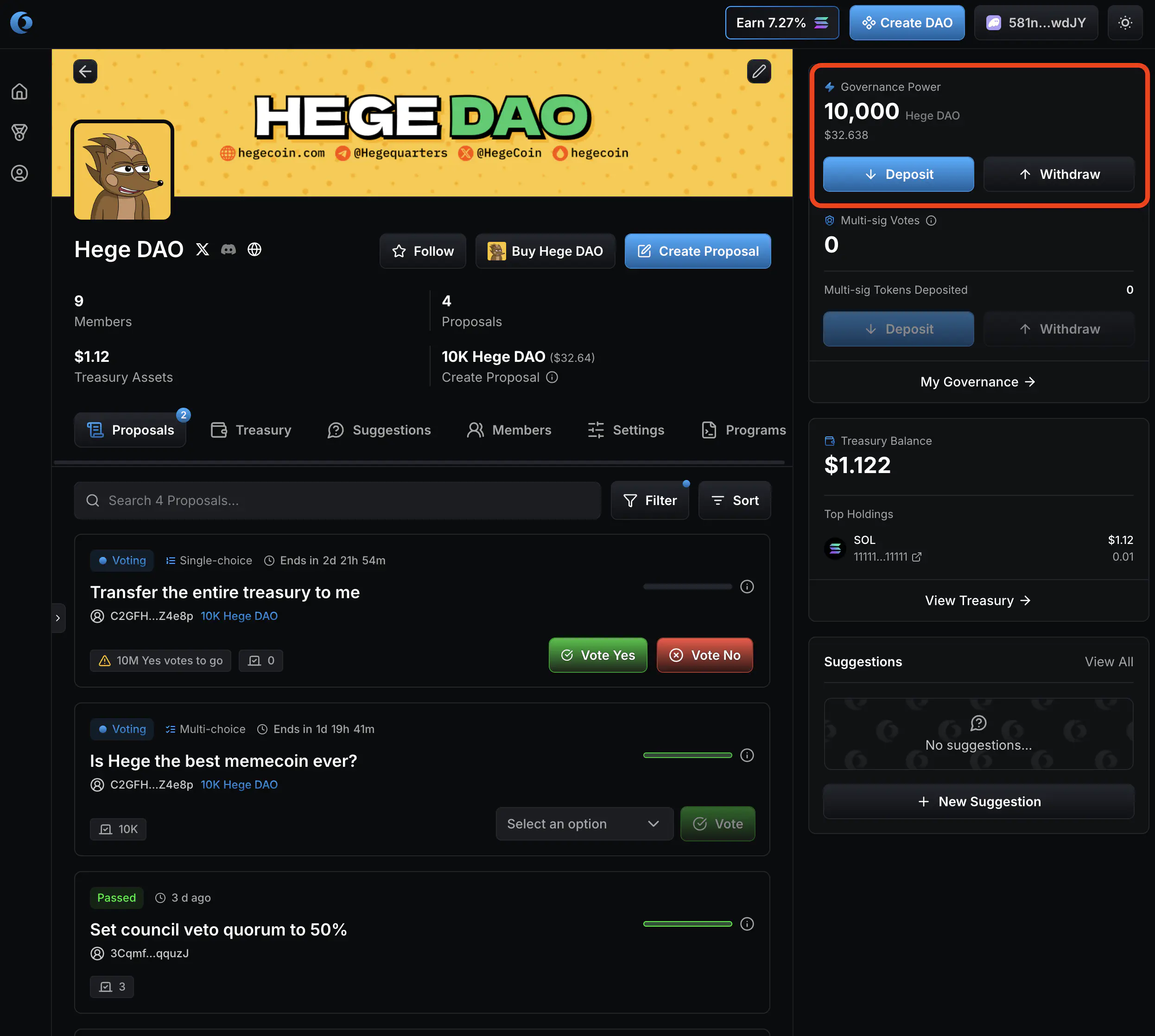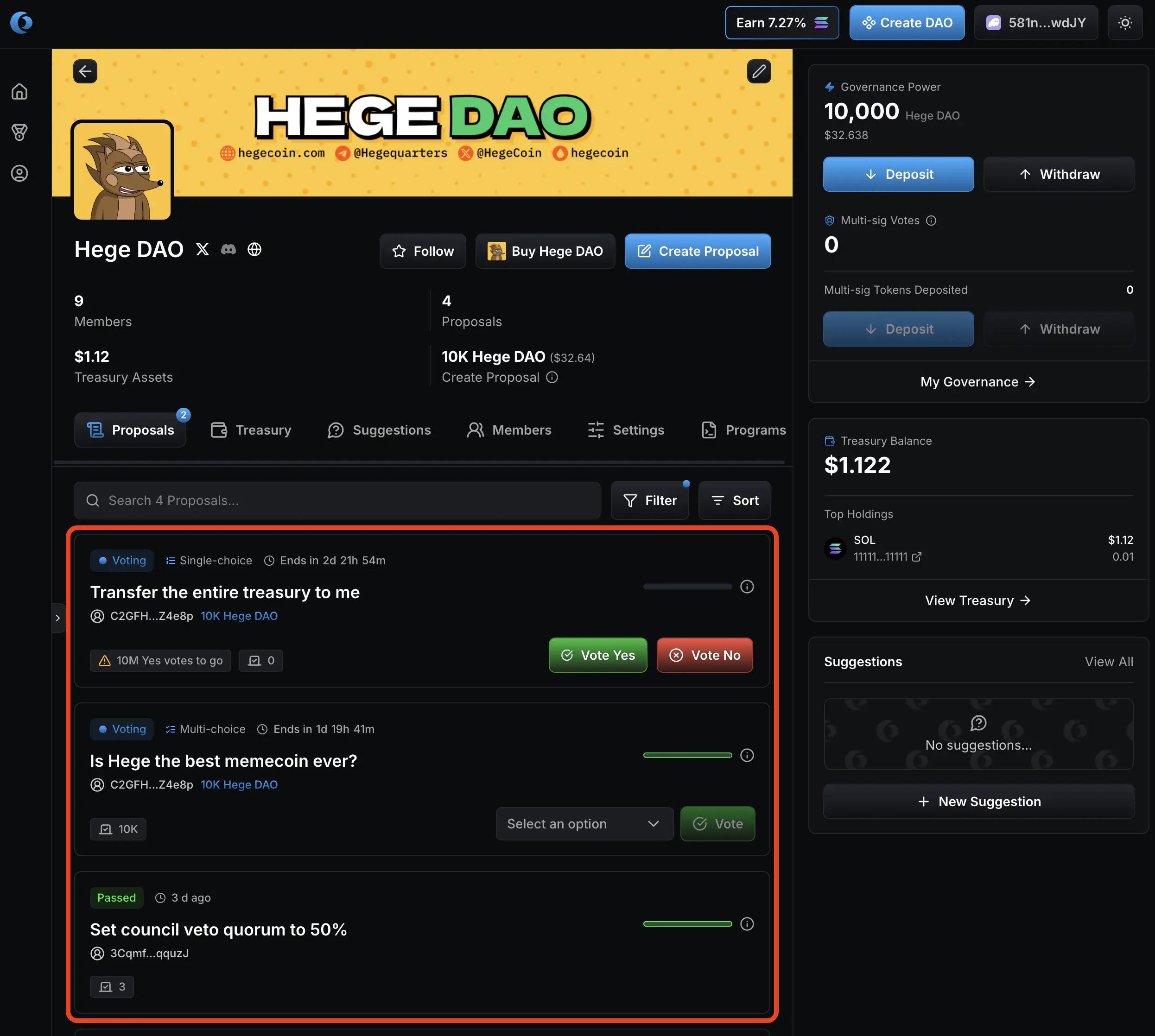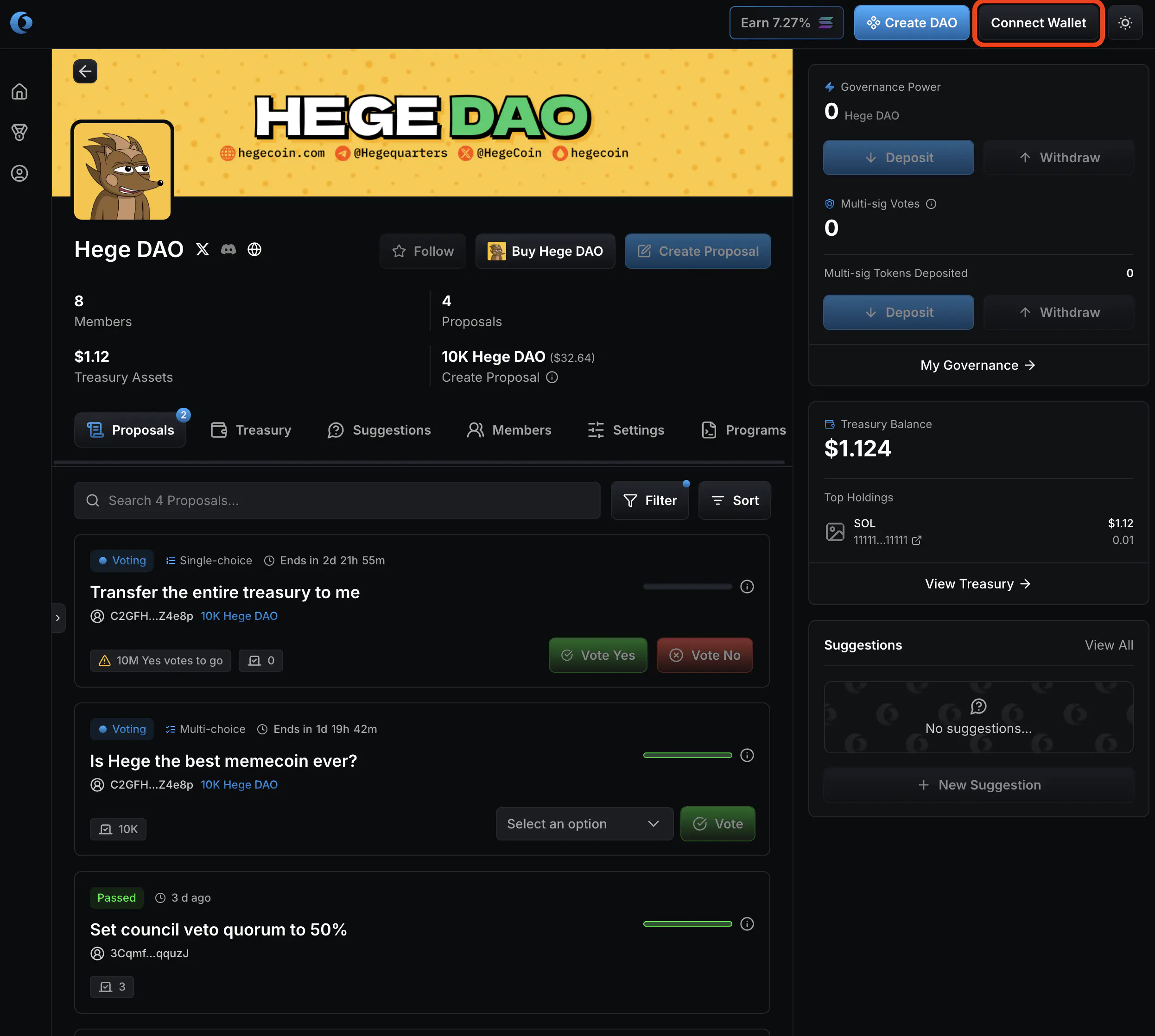 1. Go to the Hege DAO page on Realms. It should look something like this. Click “Connect Wallet” to connect your wallet.
