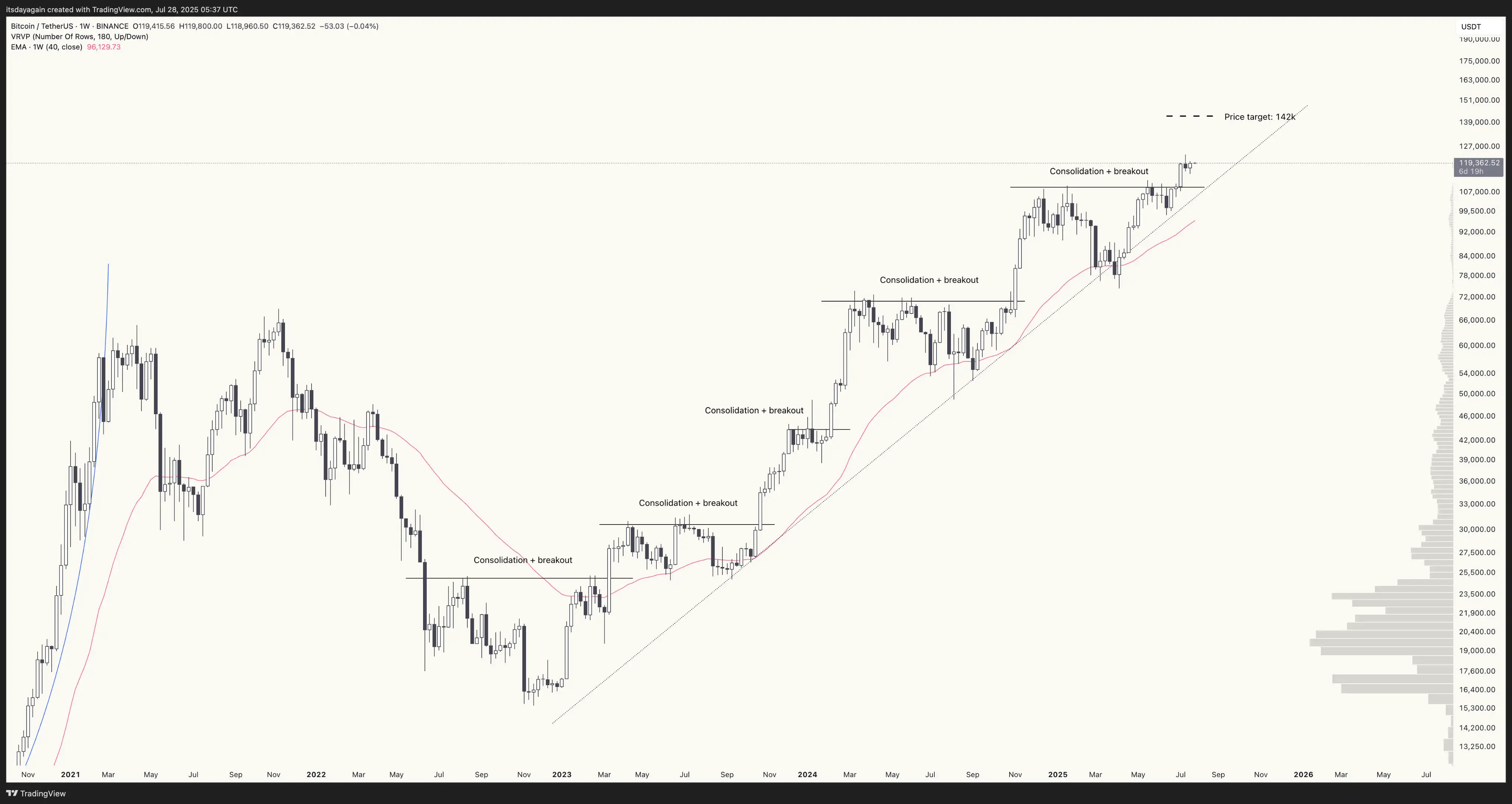 BTC/USD weekly chart, 28 July 2025. Consolidating around 118k after breaking out. Price target 142k.