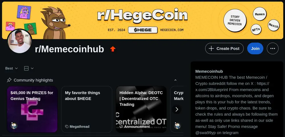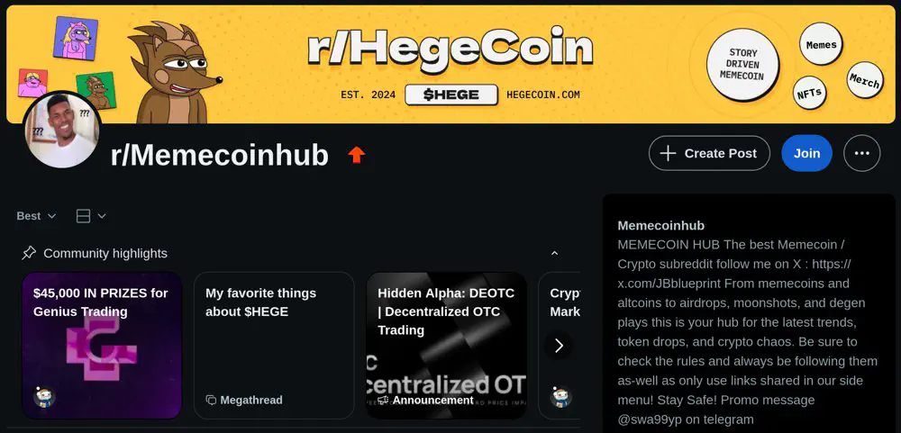 For the next month, Hege is sponsoring r/Memecoinhub. All throughout the month, our banner will be live across the subreddit, and we’ll have one pinned post per week in front of their 73,000 subscribers.