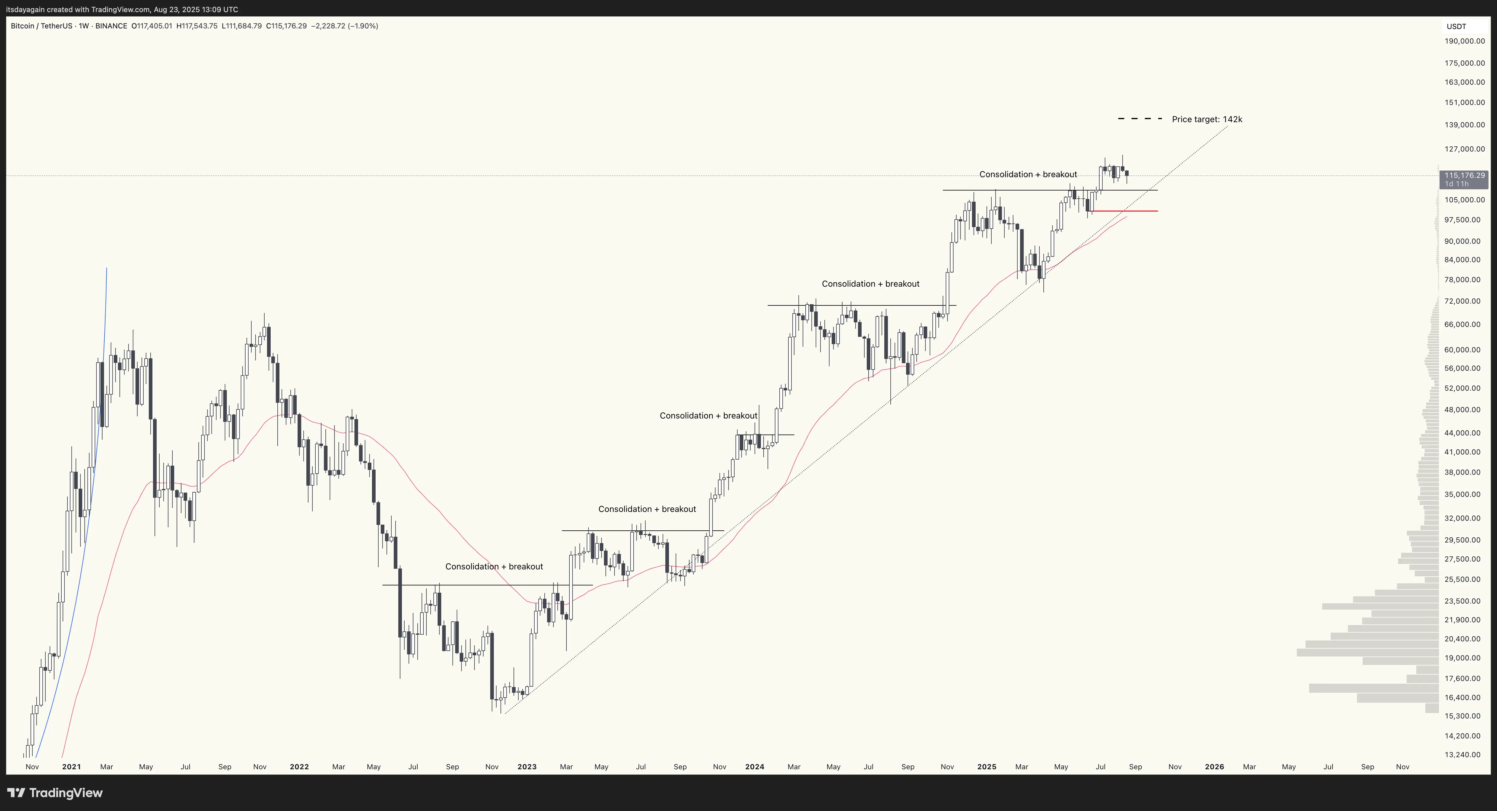 As of writing this on Sunday morning, bitcoin has not yet closed the week. But most likely it will end another week consolidating after the breakout in early July. The price target of $142k remains. Note that this is a conservative price target; it might well end up going a lot higher.