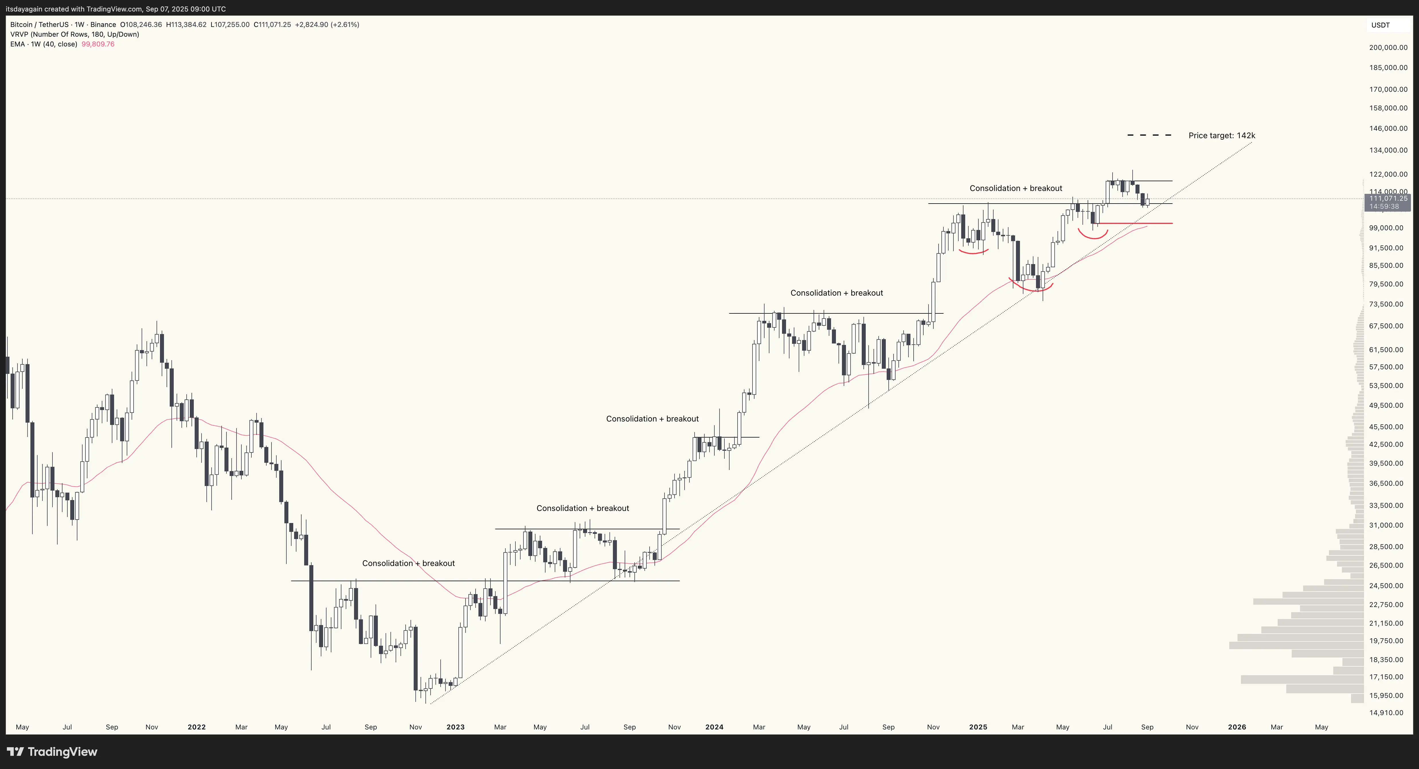 BTC/USD weekly chart, 7 September 2025. Holding the breakout level from early July. Price target of $142k remains.