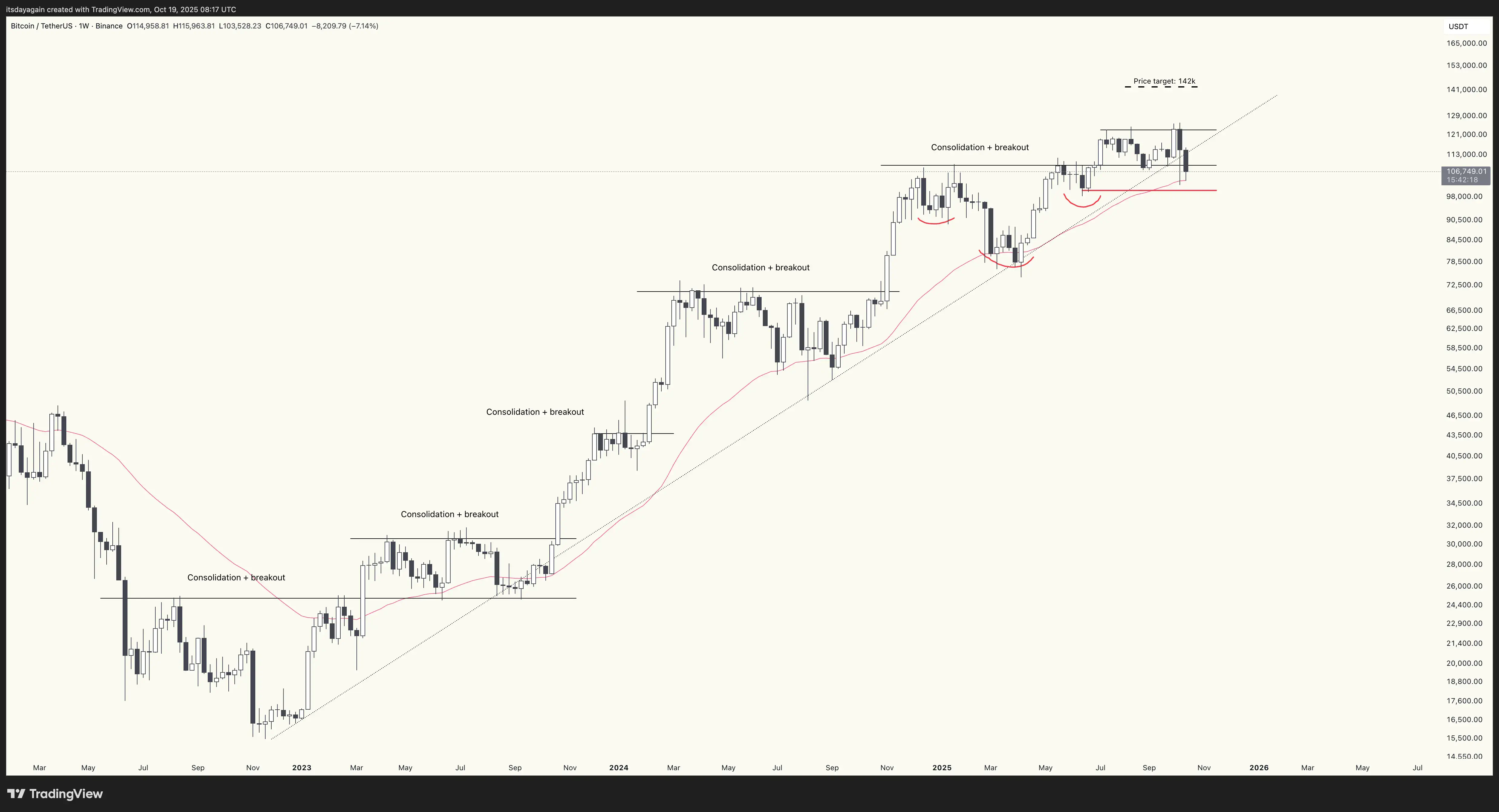 All that said, ending on a positive note it’s still too early to call the cycle top. Like we had a fake-out to the upside the other week, this could turn into a fake-down in the opposite direction. From a pure chart perspective, despite the recent weakness, the inverse head & shoulders breakout is still in play in the bitcoin chart. Meaning the price target remains at $142k. Also, price is still holding above the 40 week EMA, meaning the trend is still up.