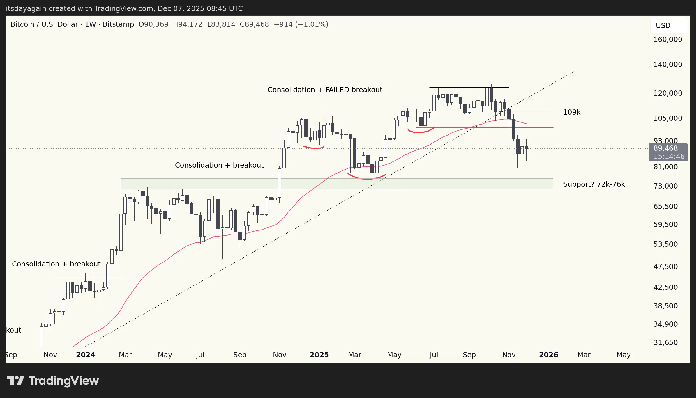 Meanwhile, crypto ended the week flat, the bounce selling off again. Like we’ve been saying over the past two weeks now, this is what we expect is going to keep happen. The bitcoin breakdown dealt heavy technical damage to the chart, and that’s probably going to take time to repair. No matter what influencers on X would like to have you believe.